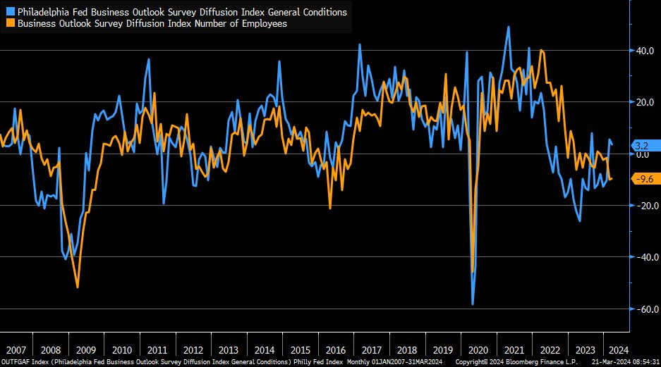 Philly Fed manufacturing index falls from +5.2 last month to +3.2 in March, (but still higher than estimate -2.5)