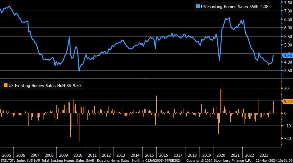 February existing home sales rose +9.5% M/M, (higher than estimate of -1.3% decline and prior month's +3.1% M/M increase).