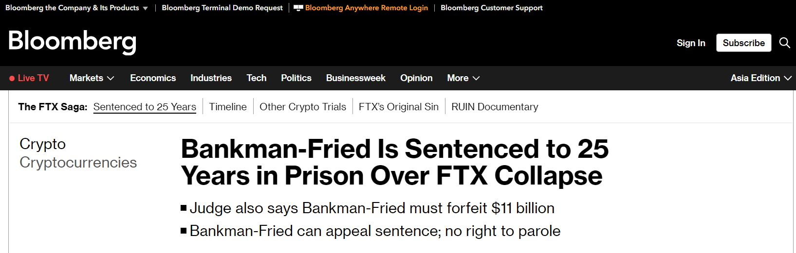 Crypto Market: Sam Bankman-Fried sentenced to 25 years in prison
