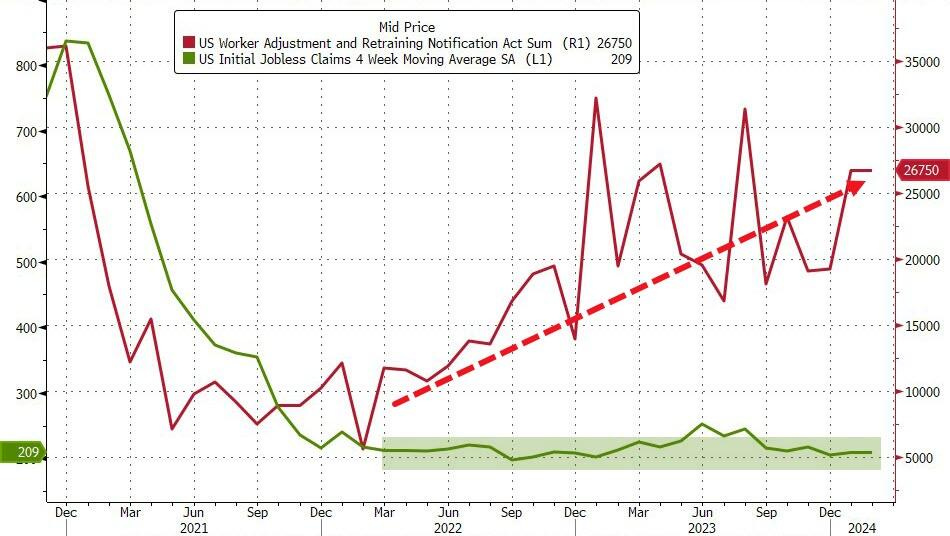Initial jobless claims this week continue to remain low despite WARN layoff notices still being quite high: