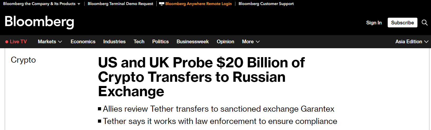 US and UK scrutinize $20B crypto transferred to Russia's Garantex exchange