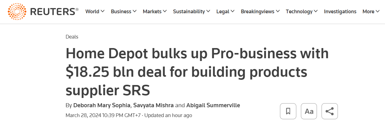 Home Depot announces plan to acquire building materials supplier SRS Distribution in a deal worth 18.25 billion USD