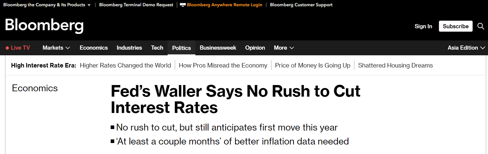 Waller: Should not rush to ease monetary policy.