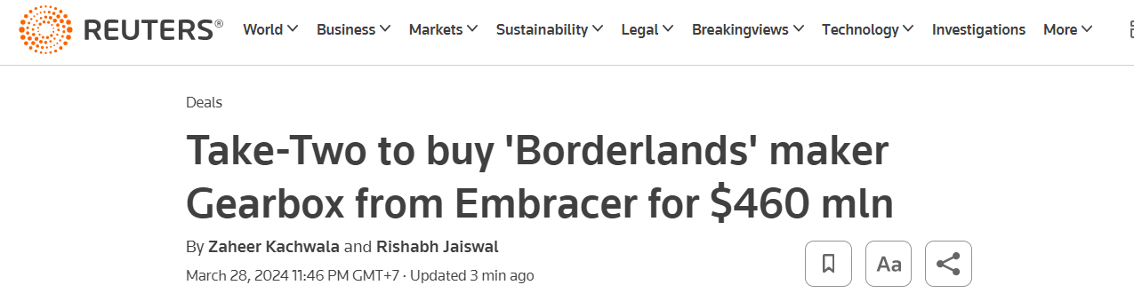 Video game developer Take-Two Interactive Software agrees to buy U.S. game developer Gearbox Entertainment for 460 million USD