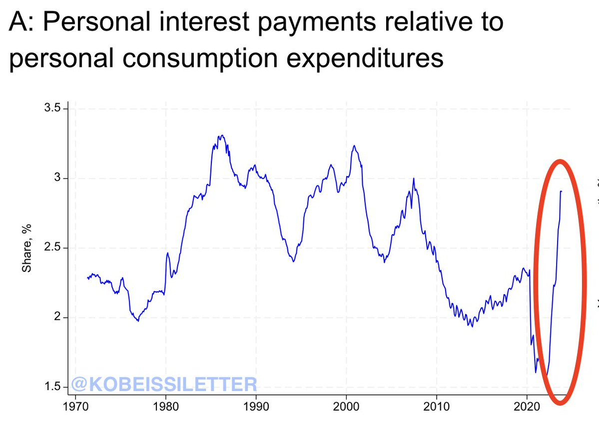 Interest payments on personal debt (excluding mortgage interest) surge to 3% of personal spending - about to surpass 2008 levels