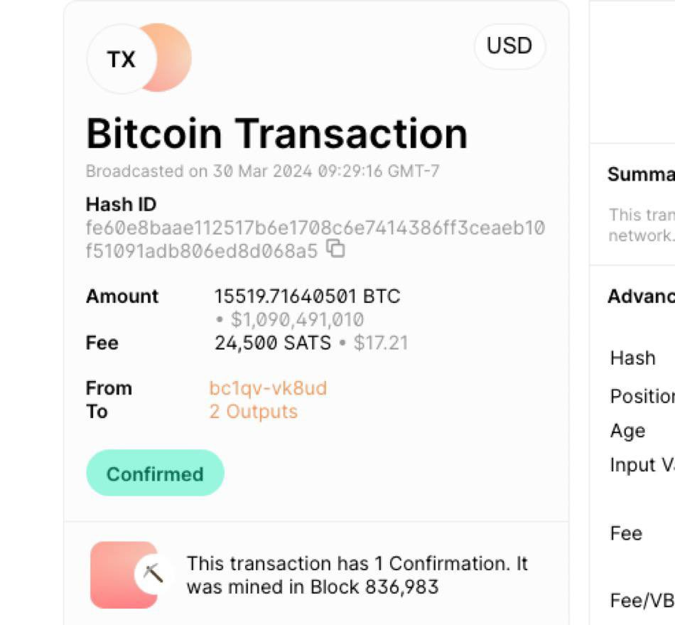An investor/institution bought 15519 Bitcoin at 70,000 USD/BTC, total 1.1 billion USD