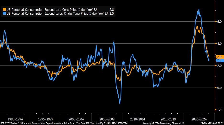Core PCE +2.8% Y/Y, in line with estimates and slightly down from +2.9% previous month