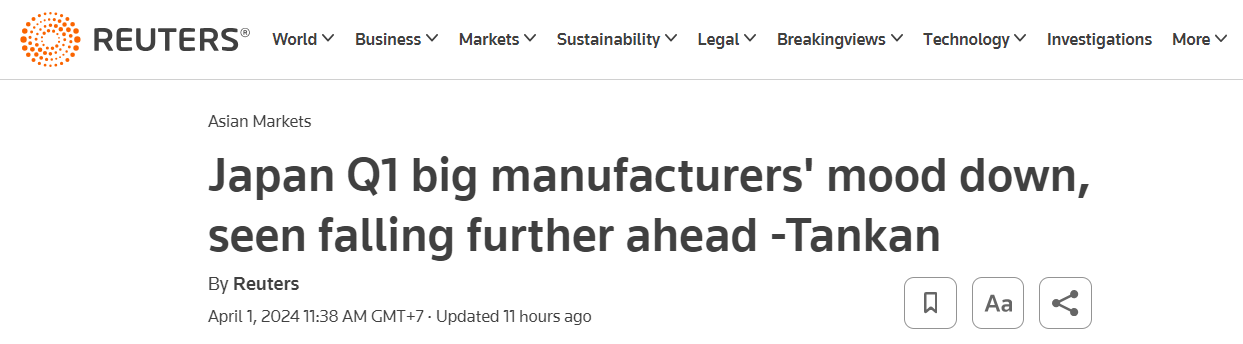 Large manufacturers' business confidence in Japan for Q1/2024 worse than previous quarter, according to Tankan survey