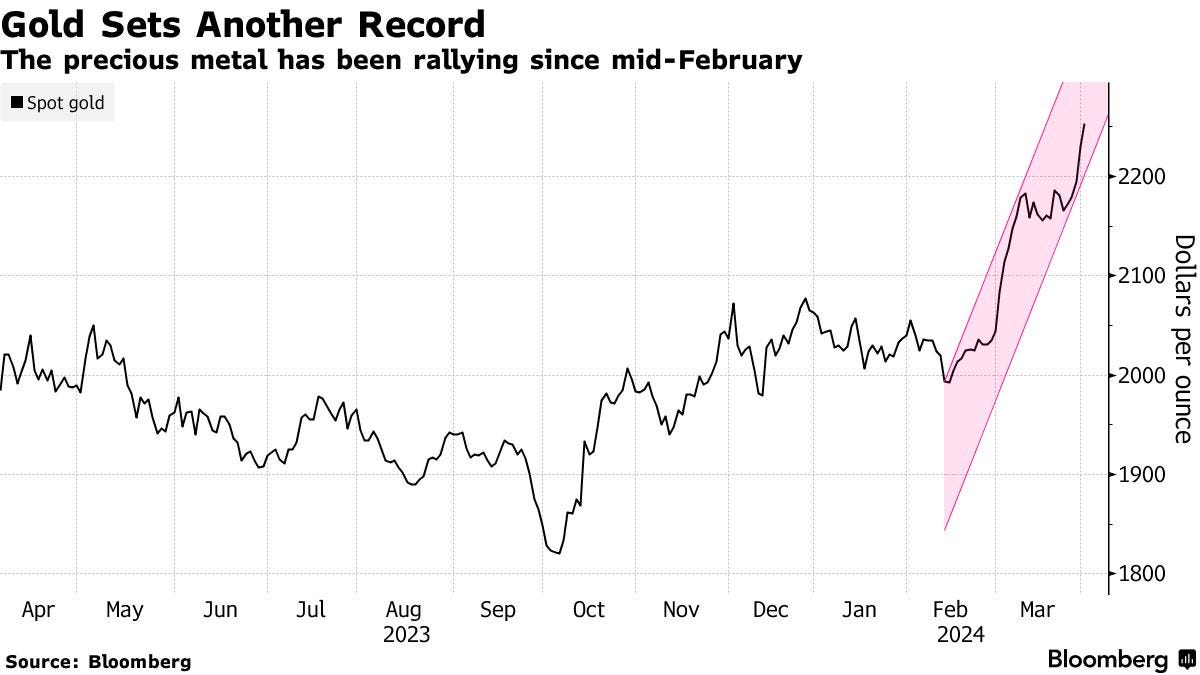 Gold price surges to 2,265.73 USD/oz today - new record, driven by geopolitical tensions and strong demand from China.