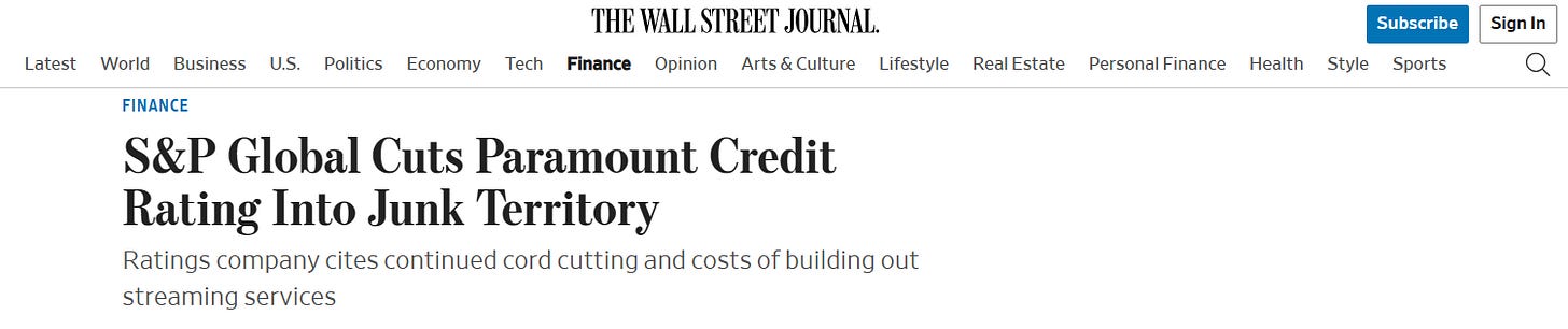 S&P Global downgrades Paramount's credit rating to high risk (junk).
