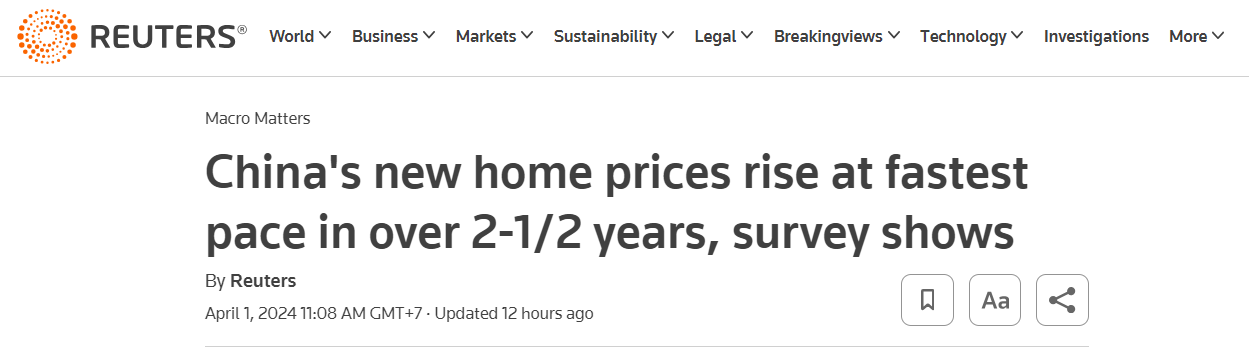 Average new home prices across 100 cities rose 0.27% M/M in March, the largest increase since July 2021, higher than February's 0.14% rise.