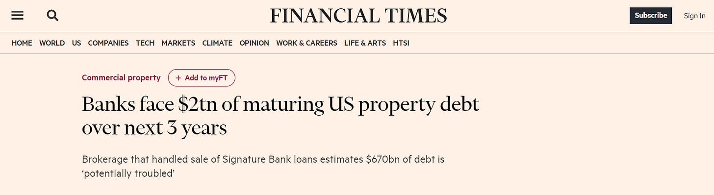 About 2 trillion USD in commercial real estate debt matures from this year to 2026 and needs refinancing at much higher rates