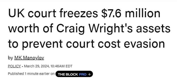 UK court approves freezing 6.7 million GBP (8.4 million USD) of Craig Wright's assets to prevent evasion of court costs.