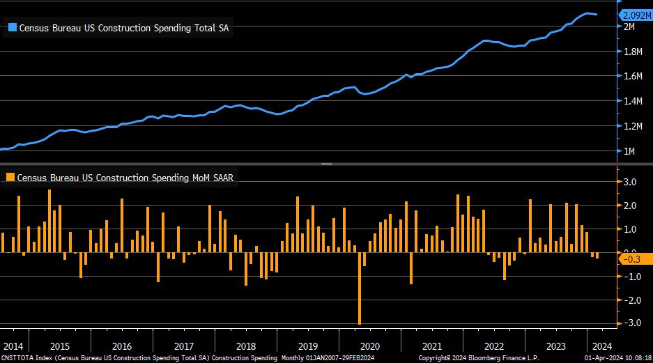 February construction spending -0.3% M/M vs estimate +0.7% and prior -0.2%, due to weak public spending
