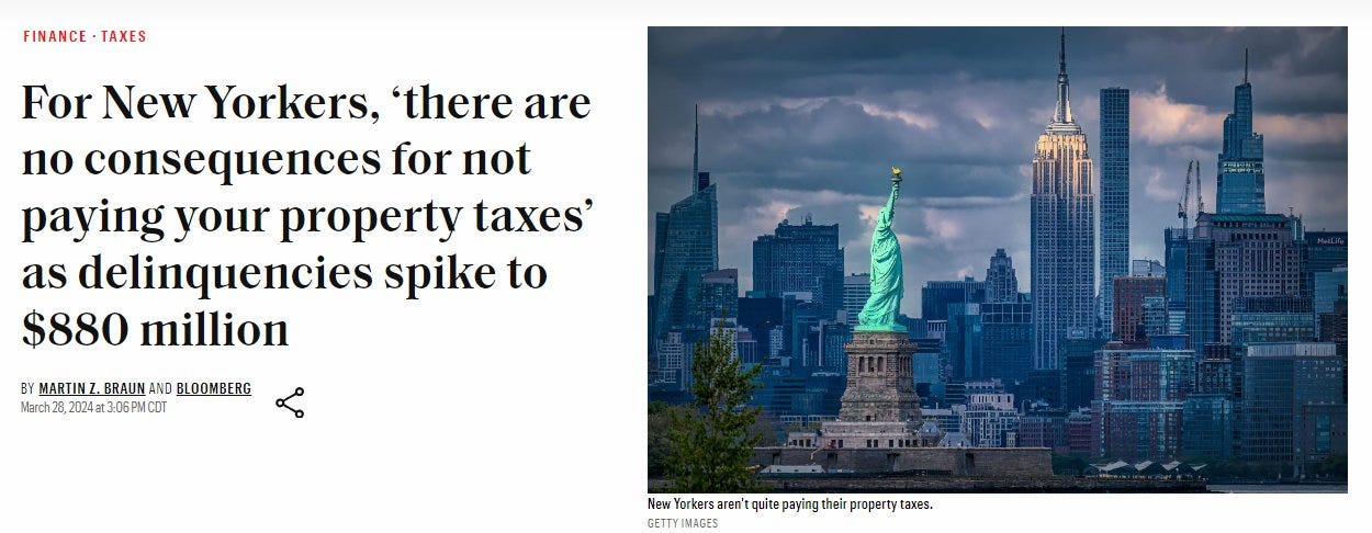 Delinquent property tax payments in New York up 30% to 880 million USD - all-time high due to no consequences for non-payment