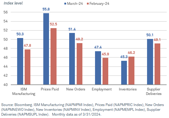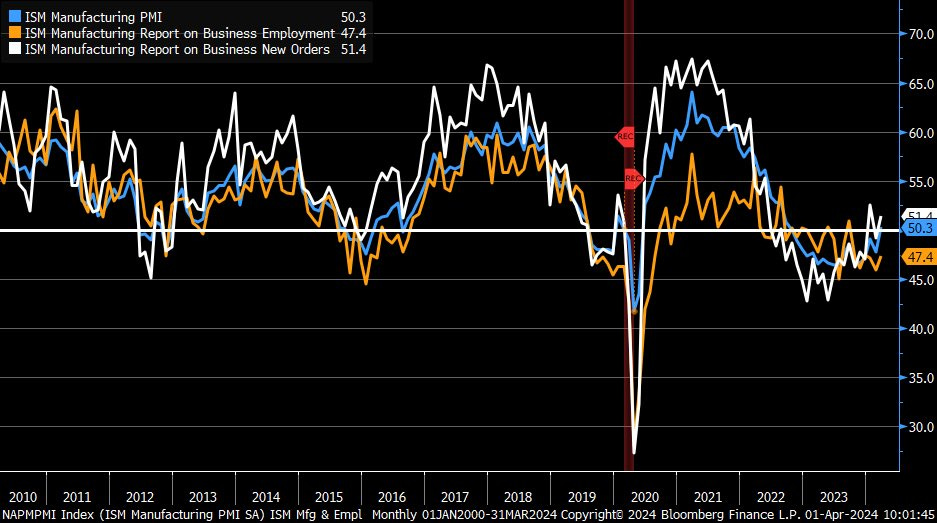 March ISM manufacturing PMI rises to 50.3 vs estimate 48.3 & 47.8 previous month (first time above 50 since Sep 2022)