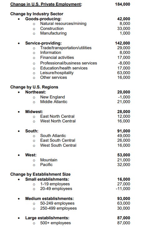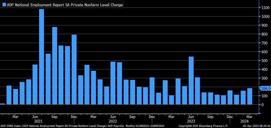 ADP Employment Report shows +184,000 jobs added in March, higher than +148,000 expected - highest monthly increase since July.