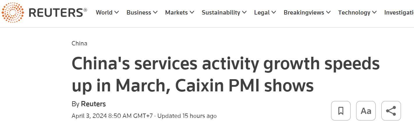 Caixin/S&P Global Services PMI rises to 52.7 in March (> previous month 52.5), 15th consecutive month of increase thanks to improved demand + efforts to boost new orders.