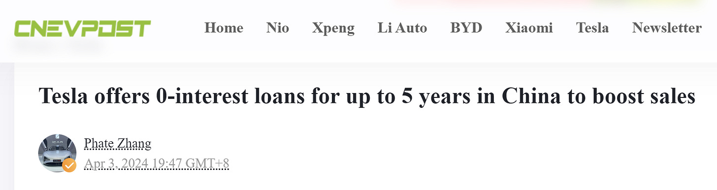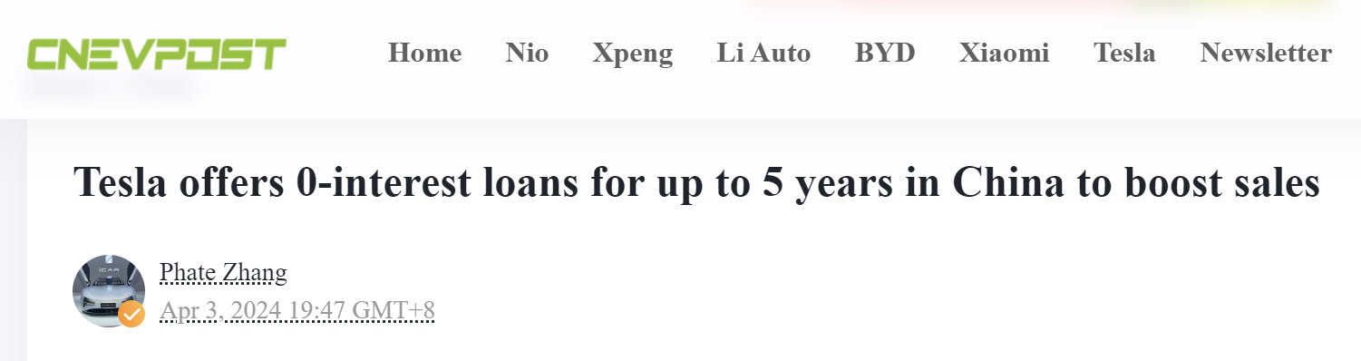 Tesla China offers interest-free loans when buying cars, up to 5 years to stimulate the market.