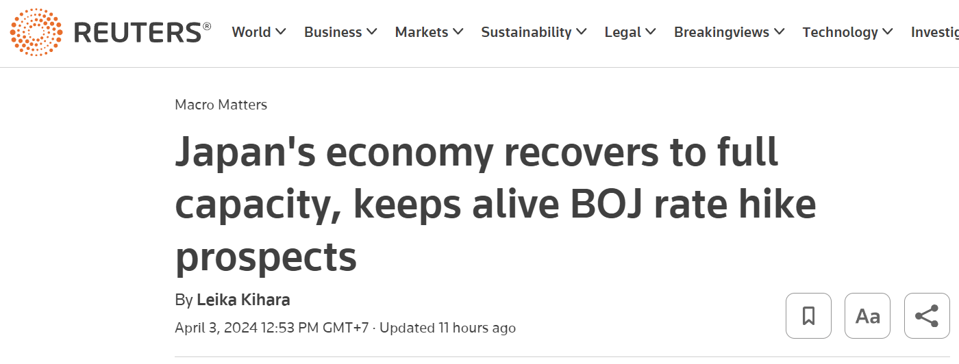Japan's output gap (output gap = actual GDP - potential GDP) reached +0.02% in the last quarter of last year, first positive level in 15 quarters.