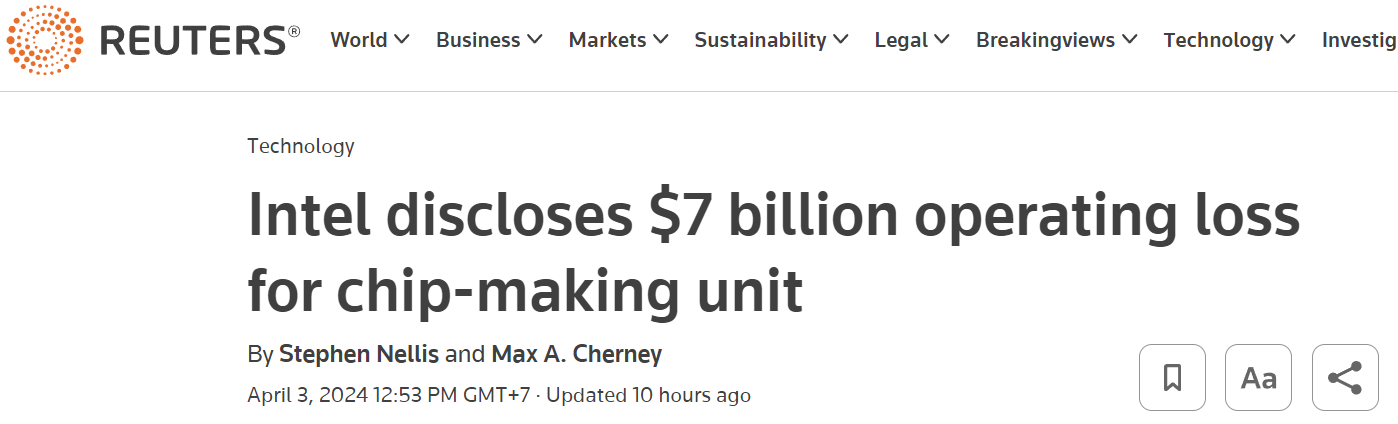 Intel's chip manufacturing reports a 7 billion USD loss, much higher than the 5.2 billion USD loss last year.