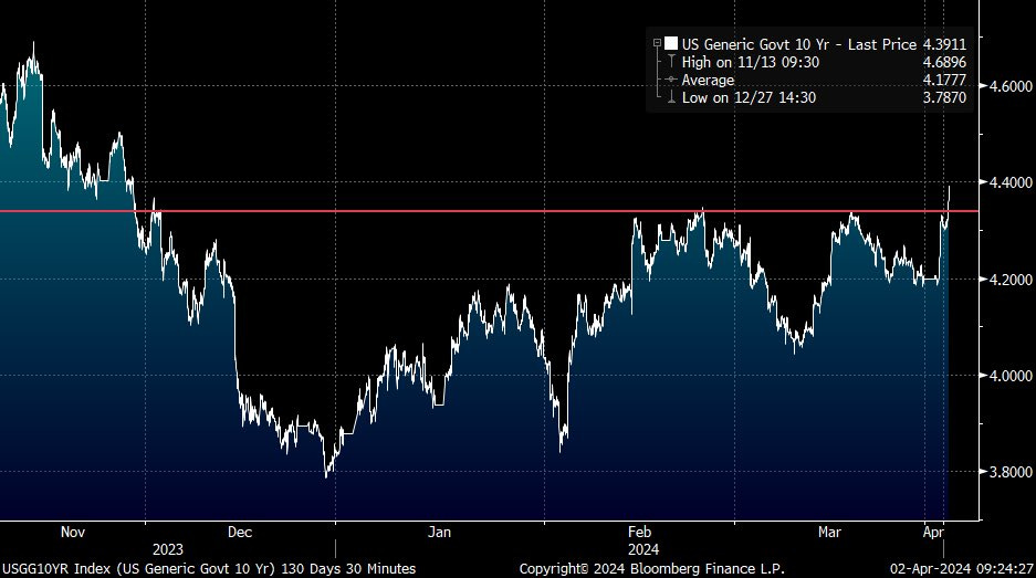 10Y bond yield surges to 4.4%, highest in 2024 after ADP report.