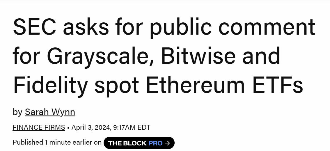 SEC seeks public comments on Grayscale, Bitwise and Fidelity's Ethereum ETF.