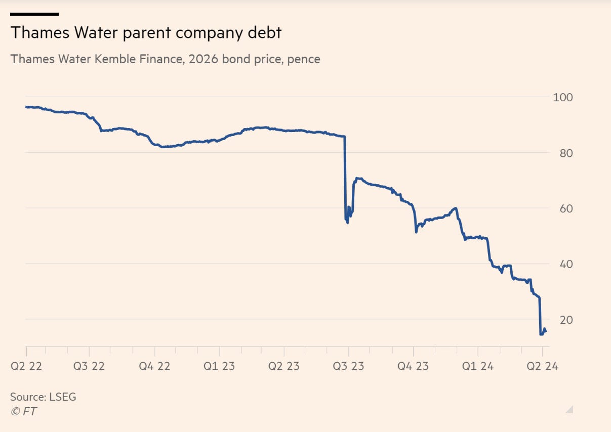 Thames Water's parent company announces default with 400 million GBP bonds becoming non-performing.