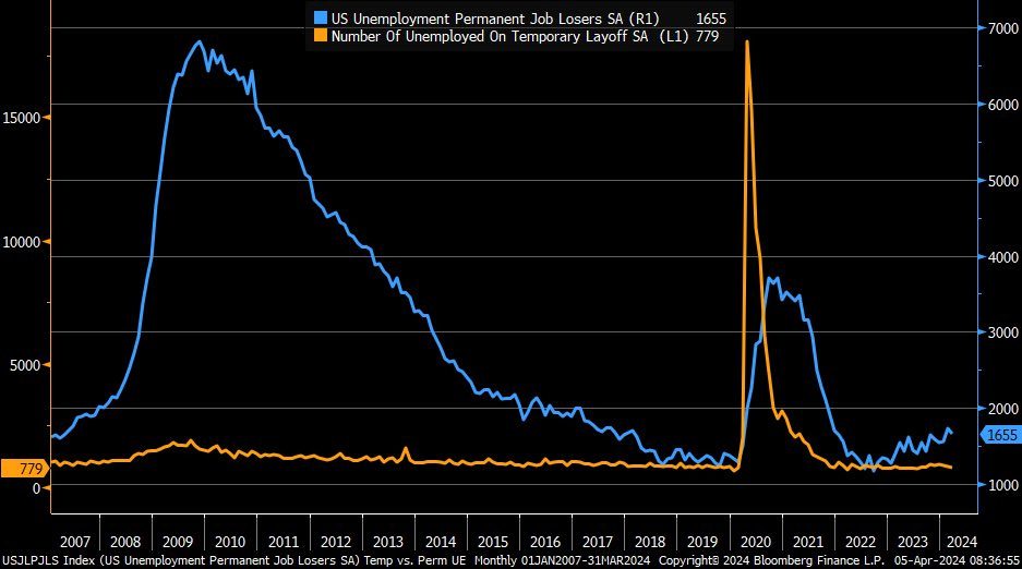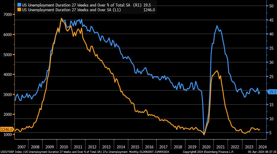 Long-term unemployment rate (> 27 weeks) in March increased slightly but not significantly.