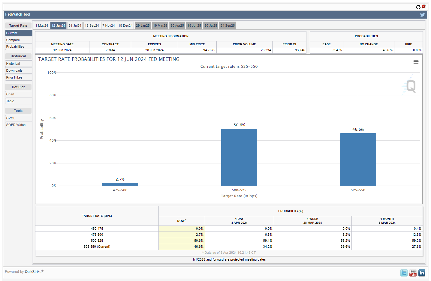 Strong labor market causes market rate cut expectations to continue declining to just over 50% in June.