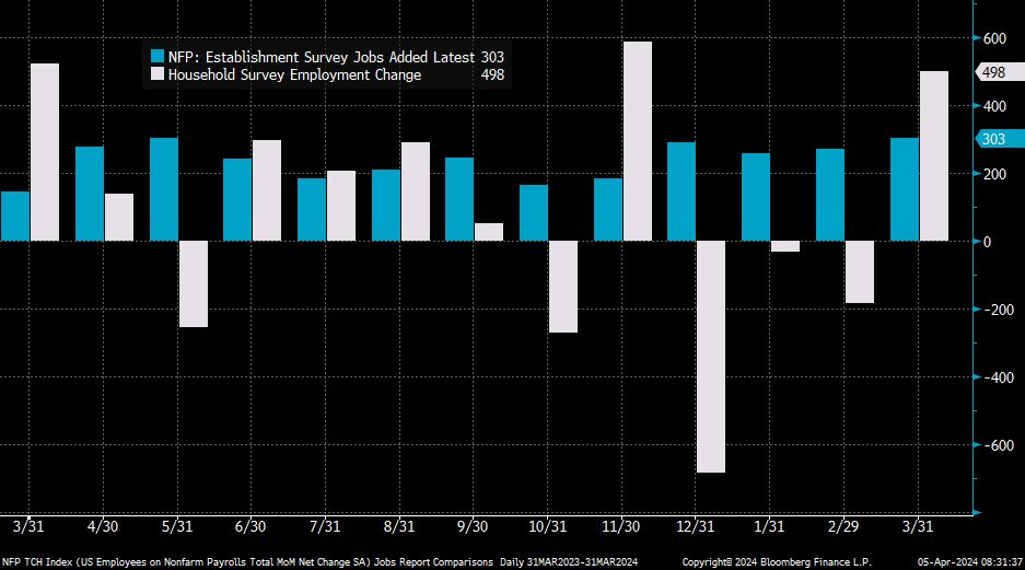 Unlike previous months (when Household Survey showed fewer job gains than Payroll survey - NFP), this month, Household survey even recorded a surprising surge in jobs +498,000.
