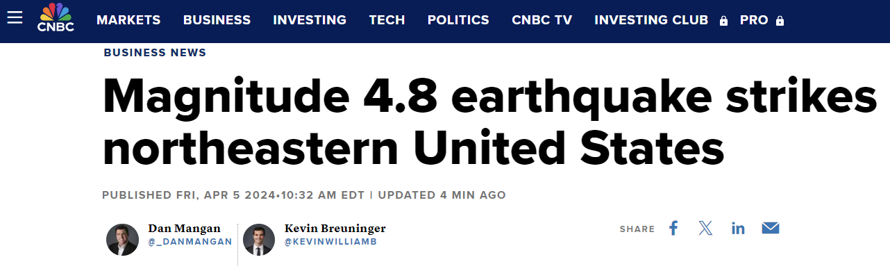 Northeast US had a strong 4.8 Richter earthquake this morning, one of the strongest on record. Many flights to/from NY diverted for emergency landings.