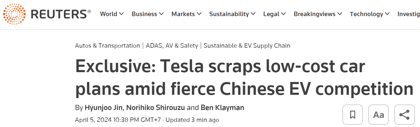 Reuters reports Tesla cancels low-price car production plan due to fierce competition from Chinese EV makers, as market flooded with cars as low as 10,000 USD.