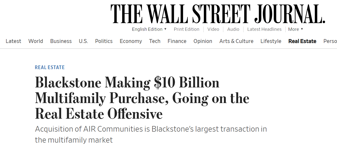 Blackstone Inc. acquires luxury apartment REIT Apartment Income REIT for 10 billion USD after a period of caution in real estate.