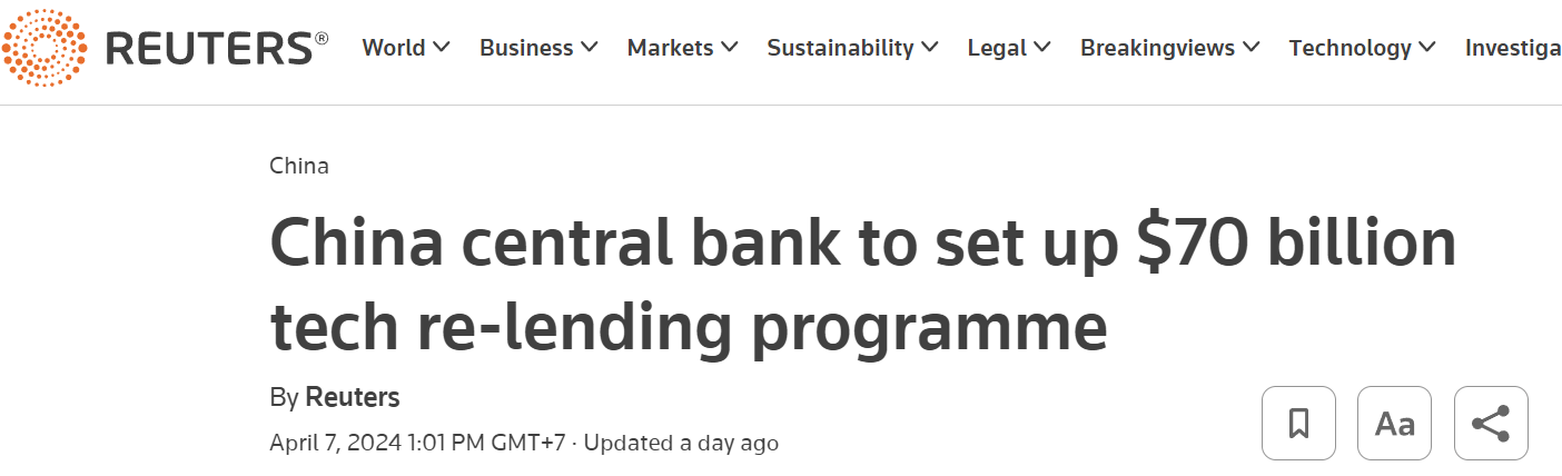 PBOC relending 70 billion USD for small and medium-sized enterprises in technology and science fields, with preferential interest rates 1.75%.
