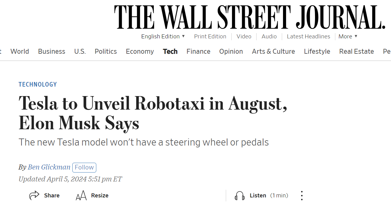 Tesla expected to unveil self-driving taxi (Robotaxi) in August this year.