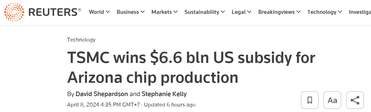 TSMC receives 6.6 billion USD subsidy to build 3 advanced chip factories in Arizona state.