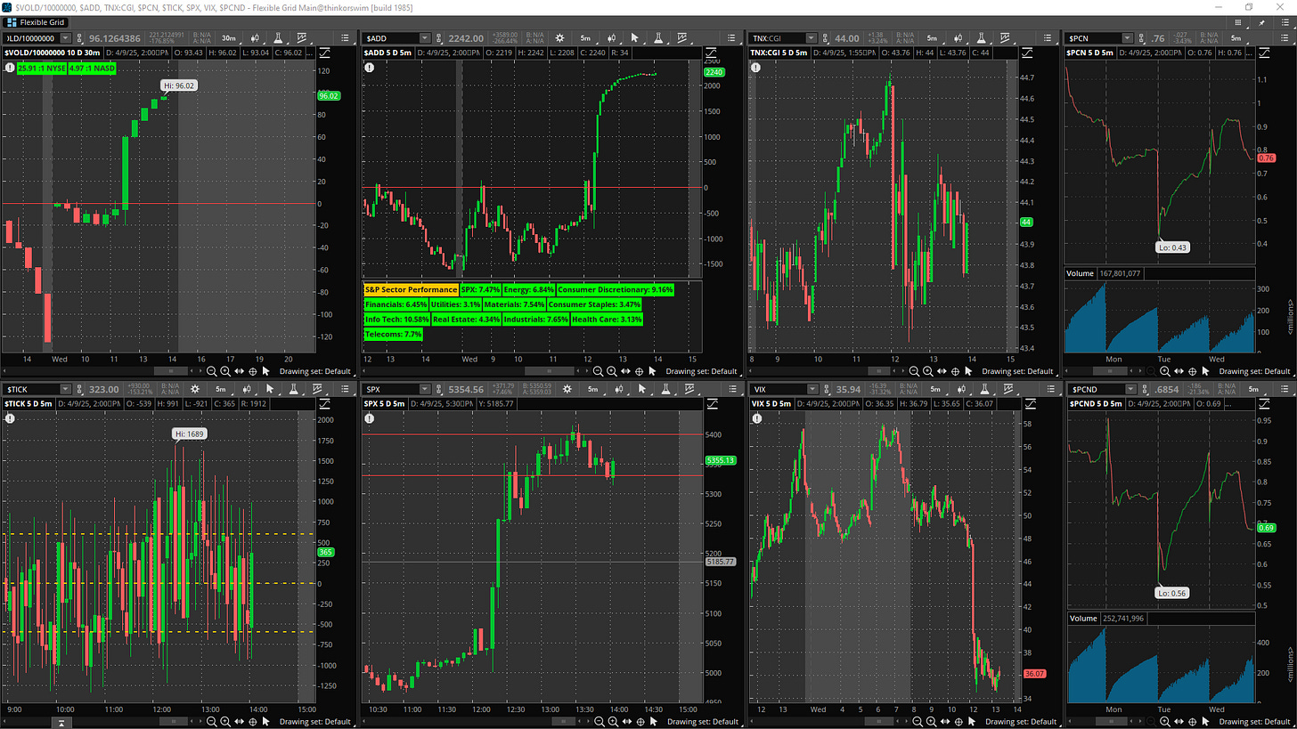 Buying force almost too strong, stocks continuously halt up with buy volume leading sell peak 40-1 on internal. VIX breaks hard -30%
