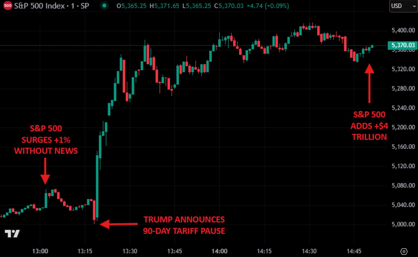When the second fake news about Trump delaying 90 days all except China, Steve commented that the strong market increase likely gave Trump the idea to do that.