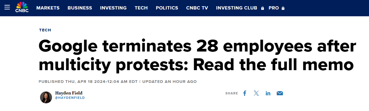 Google fires 28 employees for protesting 'cloud computing contract with Israel'