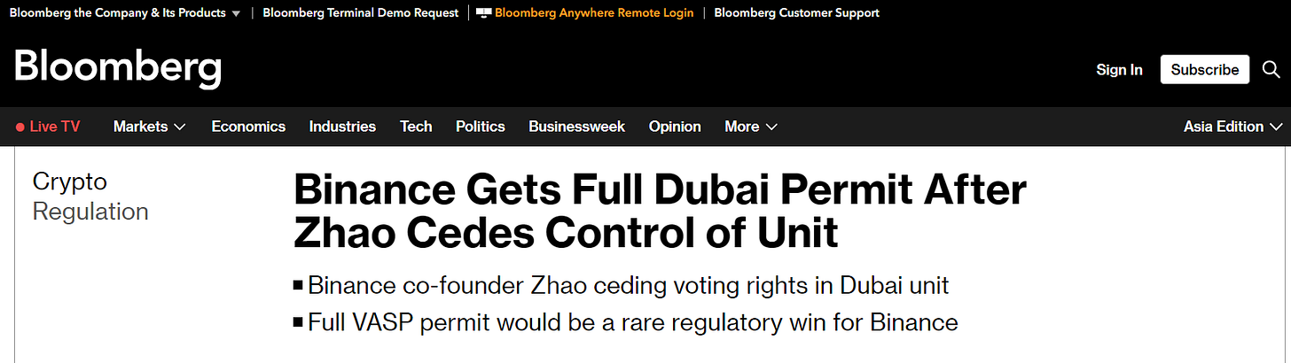 Binance receives Virtual Asset Service Provider (VASP) license in Dubai after Changpeng Zhao (CZ) relinquishes control of the local branch