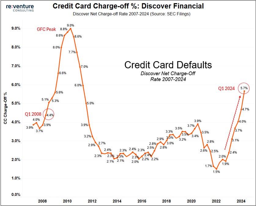Q1 credit card delinquency rate at Discover Financial surges from 4.7% to 5.7%, highest since 2008.
