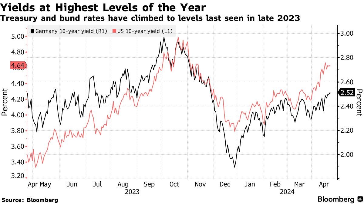 Meanwhile, demand for global bonds also decreased due to geopolitical tensions in the Middle East: yields on both US Treasuries and German bonds rose sharply.