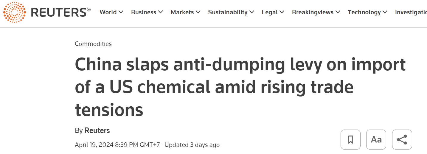 China imposes 43.5% tariff on propionic acid imports from the US.