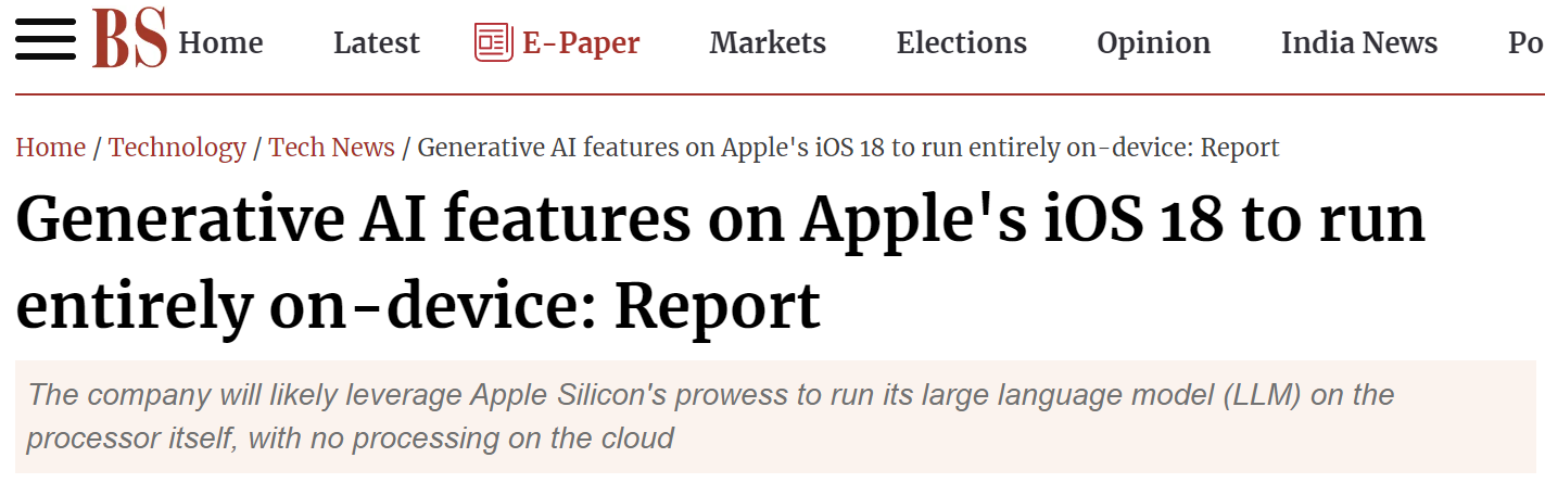 Large language models (LLM), iOS 18 AI features will be processed on-device instead of through the cloud system.