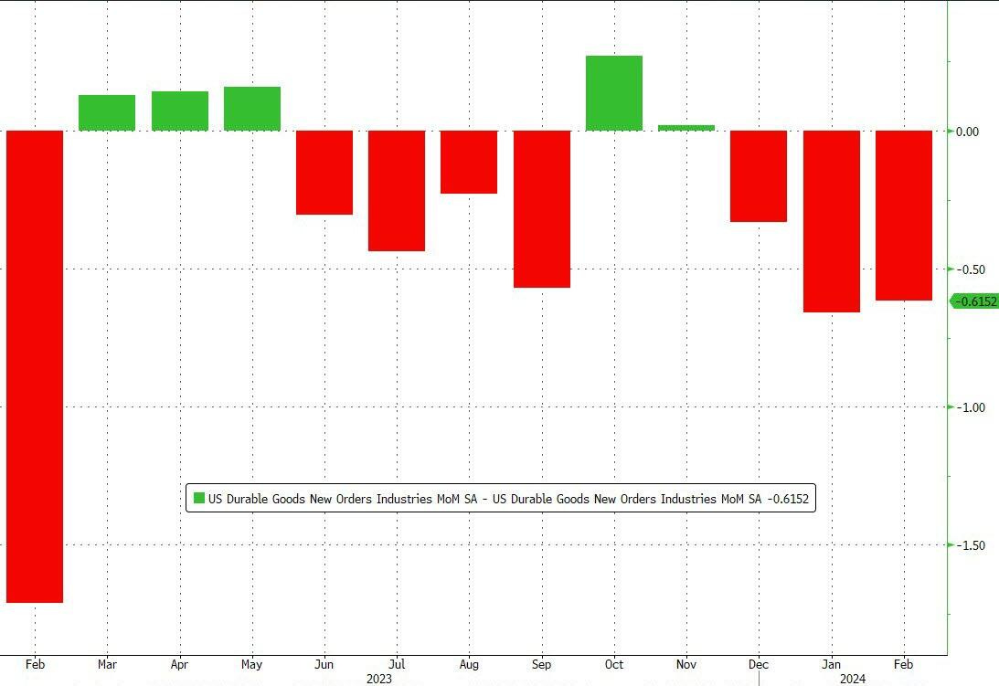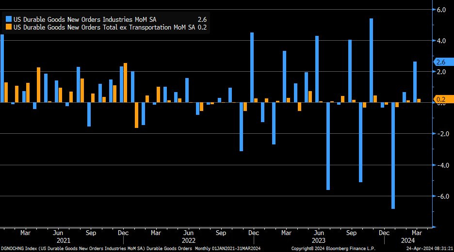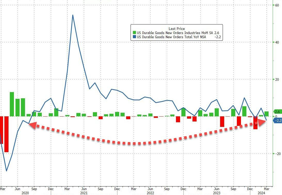 March durable goods orders increase +2.6% M/M, but -2.2% Y/Y — largest drop YoY since Covid lockdown period.