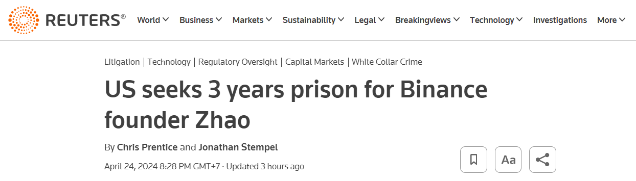 US prosecutors propose 3-year prison sentence for Binance founder CZ.