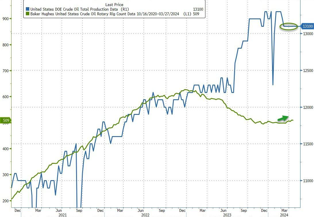 US crude oil production unchanged at 13.1 million bpd (near record high) but rig count growth slowing