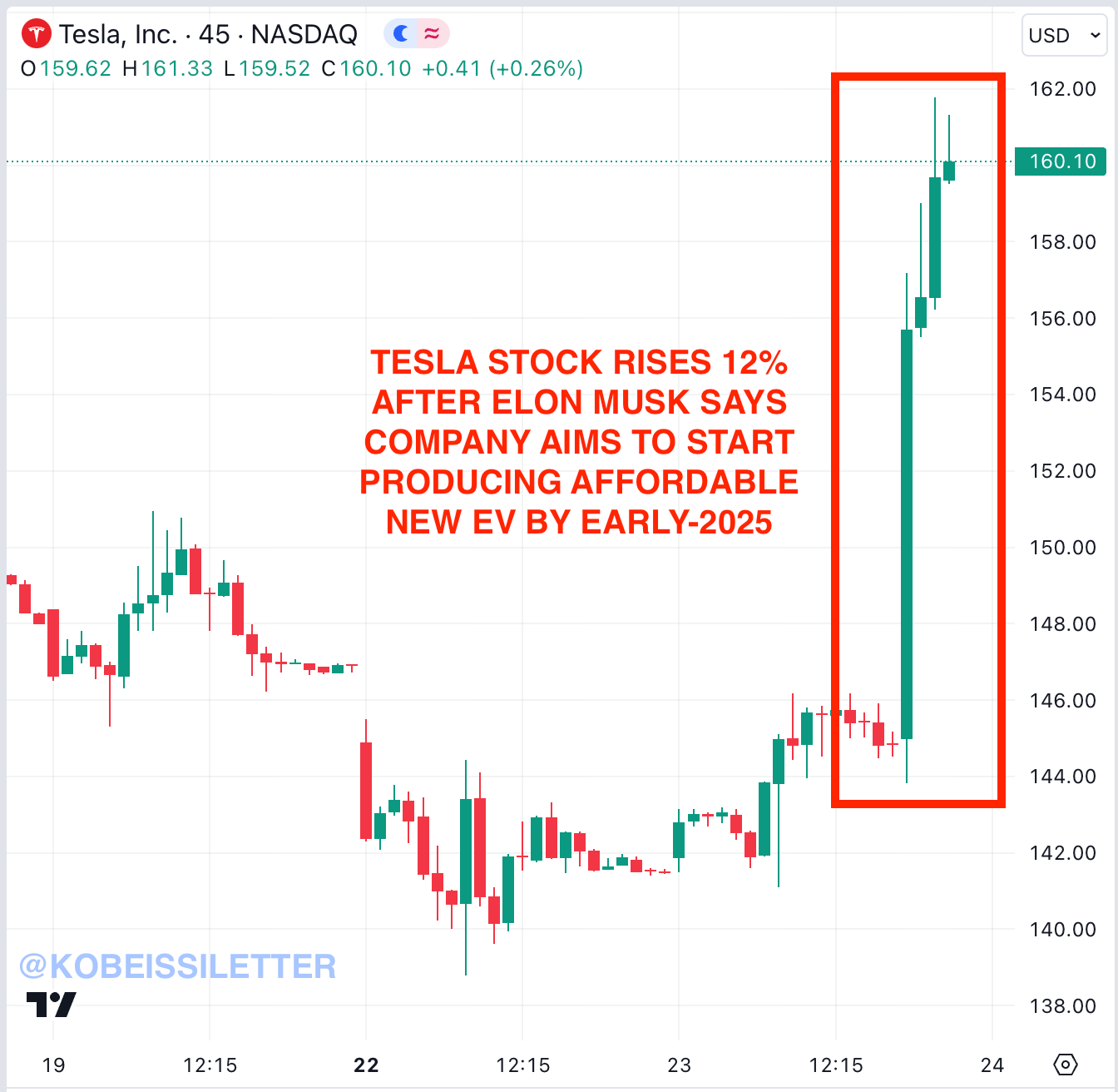 Tesla stock up 12% after Elon Musk said the company aims to start production of new affordable EV in early 2025.