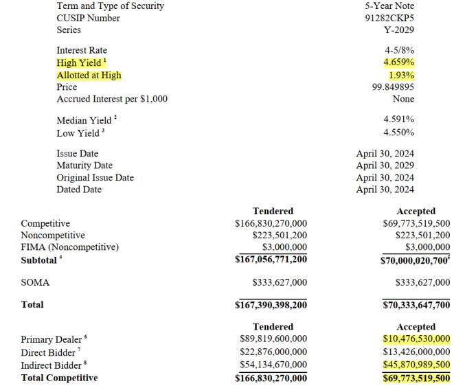 This is not a very promising auction due to the mild tail, accompanied by signs of reduced demand (bid-to-cover down while dealer bids up) for this favored 5Y intermediate bond.